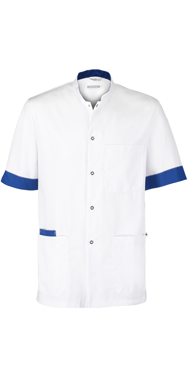 Rechtvallend|Drukknoopsluiting|Opstaande boord|Diverse contrastdelen|Borstzakje|2 opgezette zakken|65% polyester/ 35% katoen|245gr/m2|60 graden wasbaar|Lengte circa 80 cm