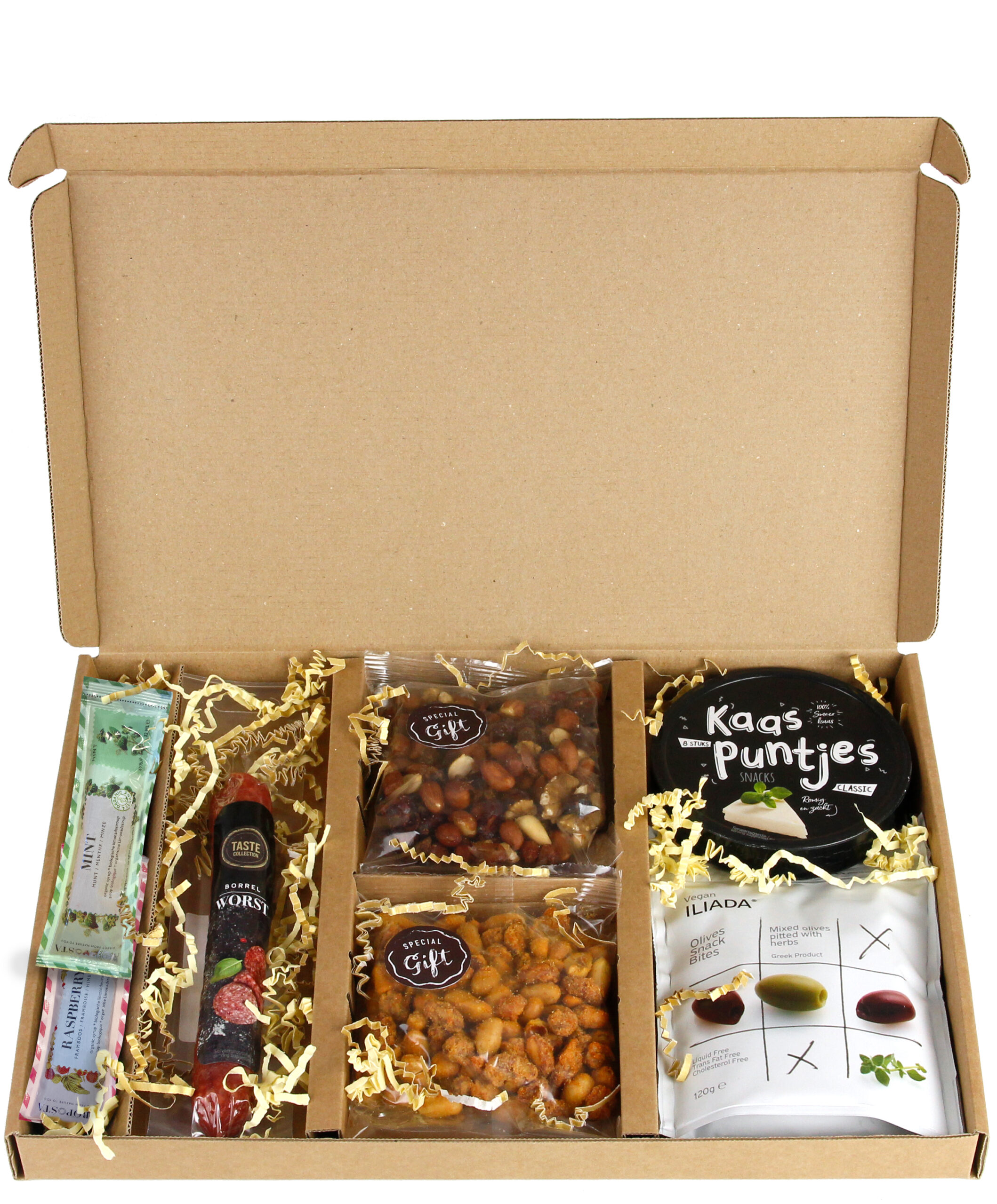 kaaspuntjes, borrelworst, notenmix 2 x, olijvenmix, sachet siroop 2x