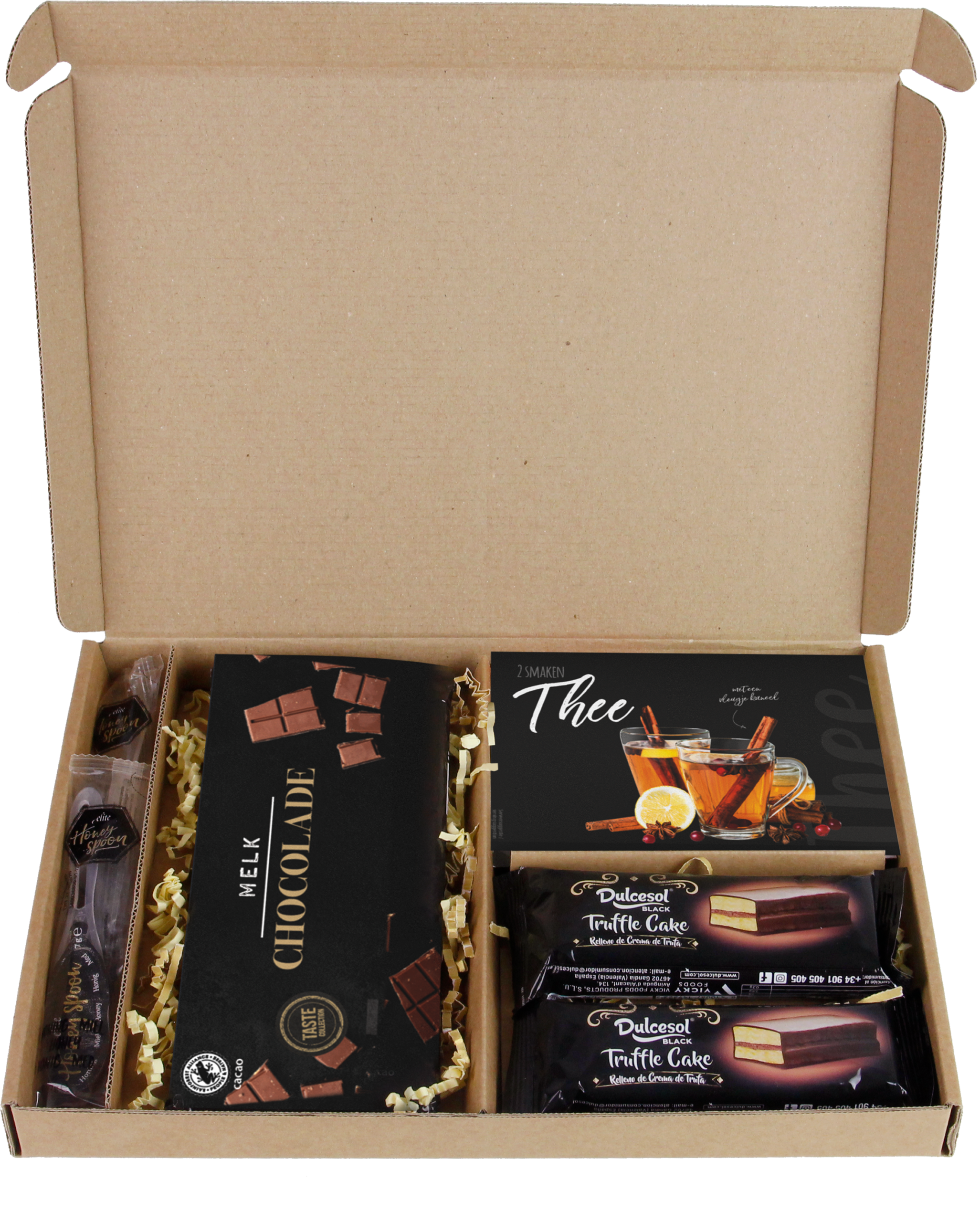 truffle cake 2 x, thee 8 x, honeyspoon 2 x en melkchocolade tablet