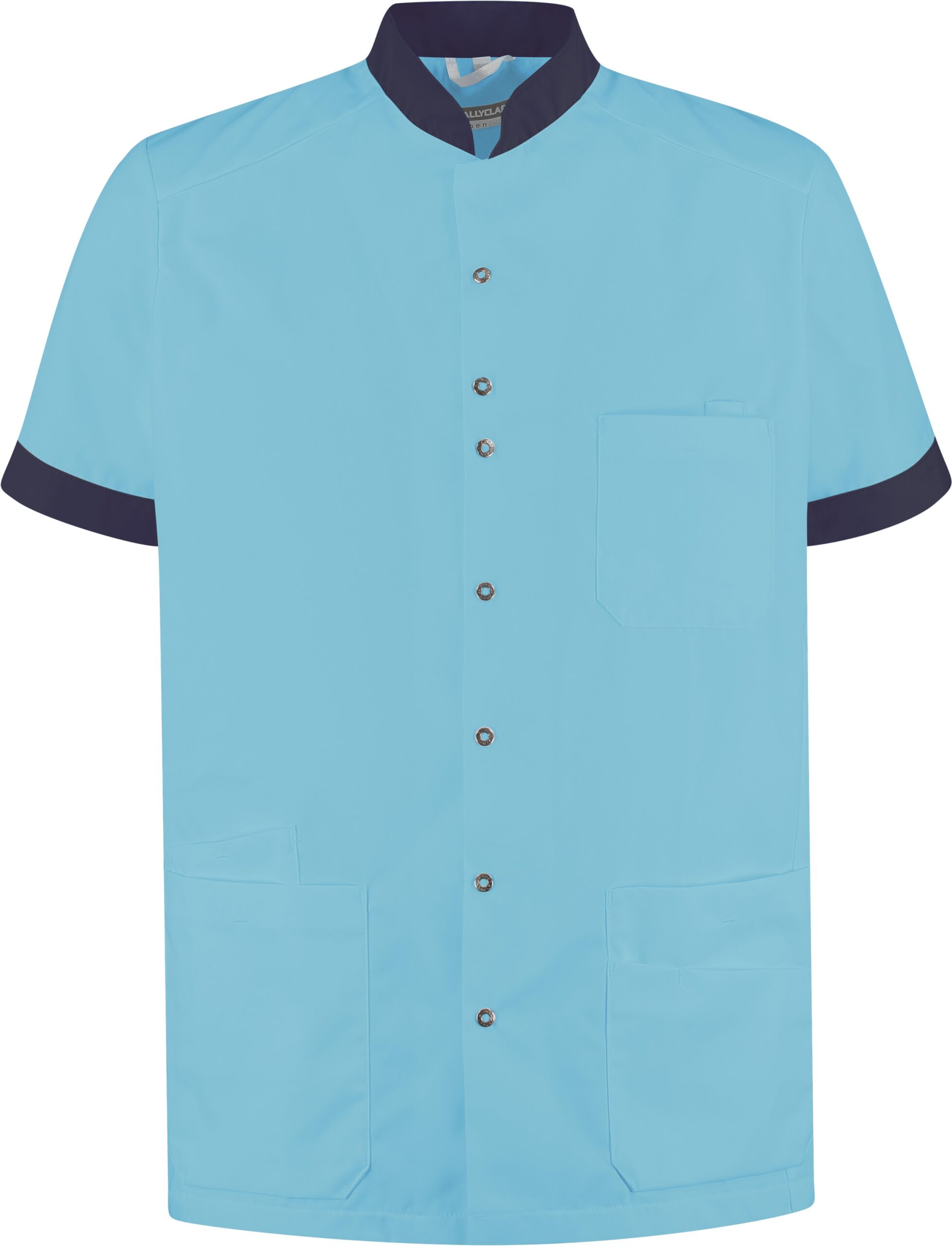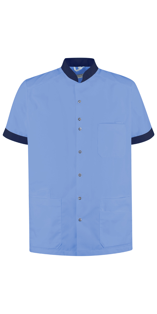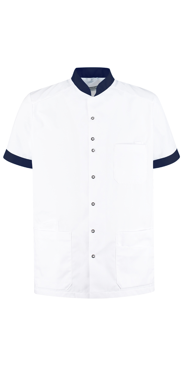 Moderne pasvorm | opstaand boordje | diverse contrastdelen | drukknoopsluiting | 1 borstzakje met pennenzakje | 2 ruime heupzakken waarvan één met telefoonzakje en de ander met een extra opgezet zakje | 2 zijsplitjes | telescoopmouw met tricot voor extra bewegingsvrijheid | jaslengte ca. 79cm
