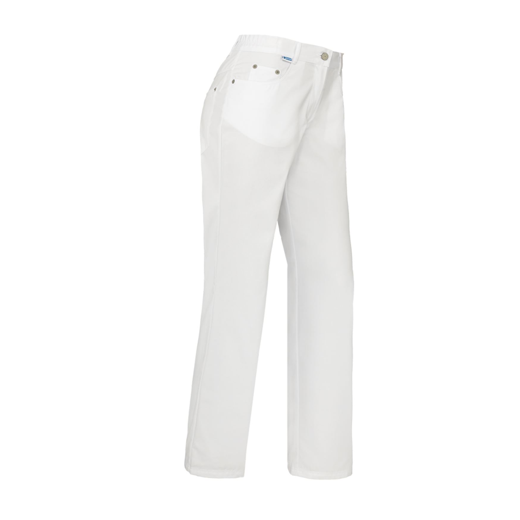 5-Pocket damespantalon (jeanslook) in een stretchstof met verlaagde taille, welke gedeeltelijk is voorzien van elastiek en rechte broekspijpen.