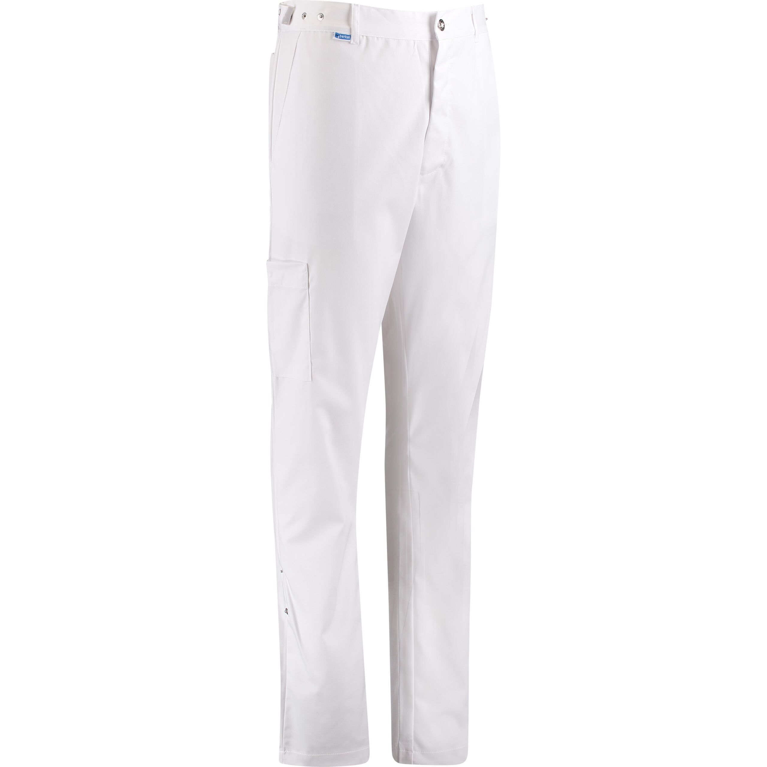 Unisex pantalon met slimfit pasvorm, gulpsluiting d.m.v. drukknopen en jeansknoop, flatfront, steekzakken, dijbeenzak, tailleerlummels en oprolpijpen d.m.v. lummel-bevestiging.